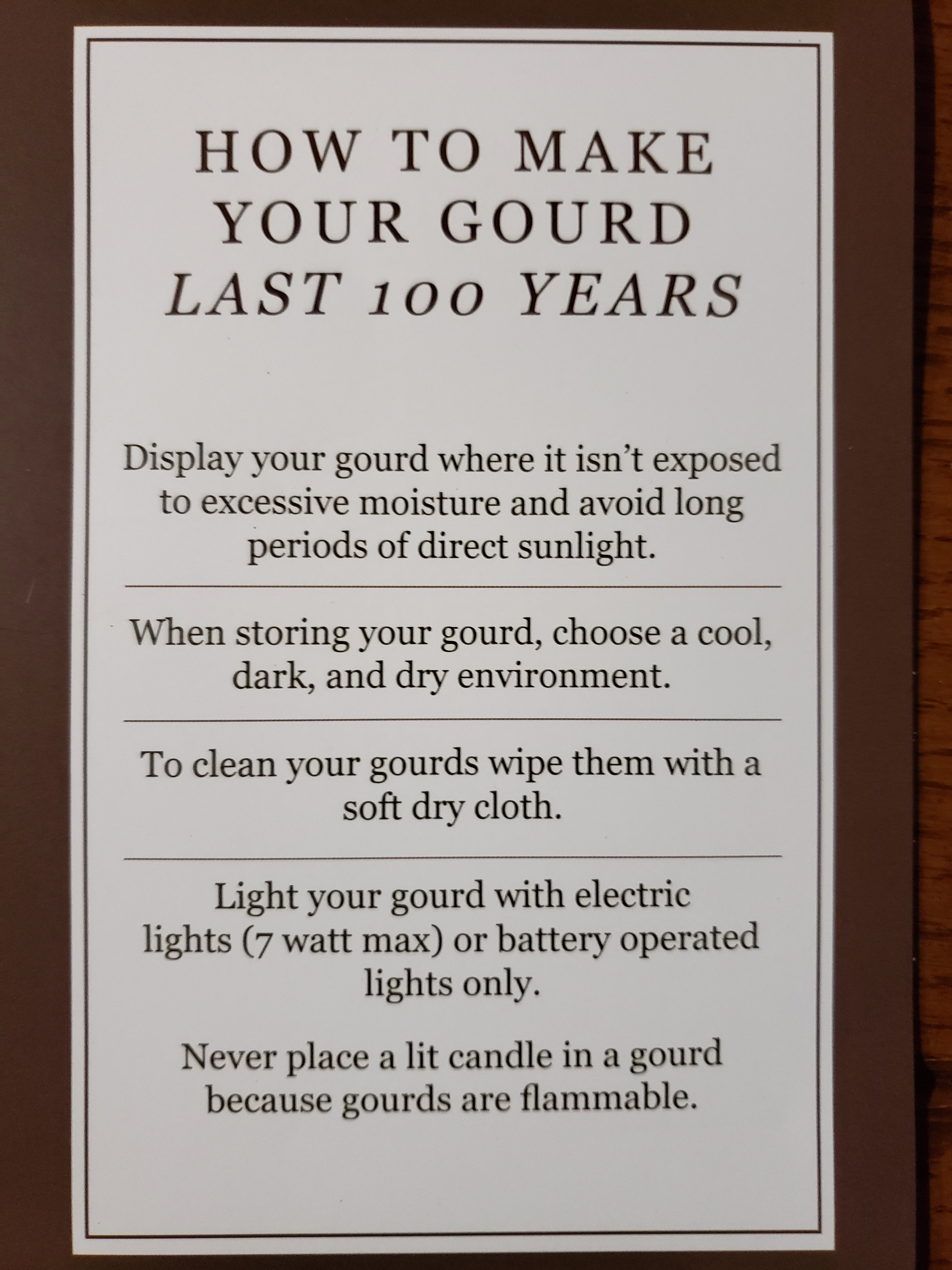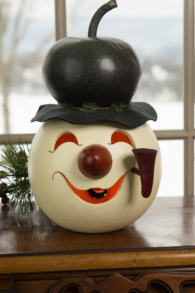 Meet Walter! Winter decor that will melt your heart! Made in Pennsylvania by a family business that grows, designs and creates heirloom indoor decor pieces from gourds. Walter is about 6" in diameter. Each one is unique so measurements vary slightly. Walter lights up, and the cord and amber bulb are included. Made in USA.